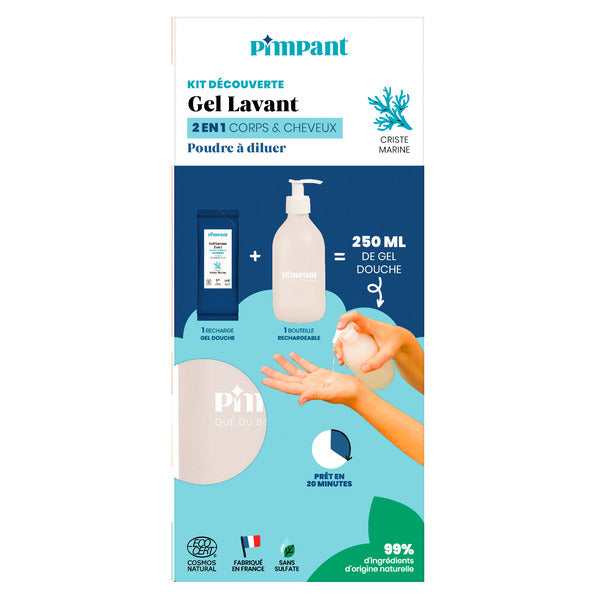 Ce kit contient 1 bouteille 300ml + 1 recharge de gel douche en poudre à diluer.