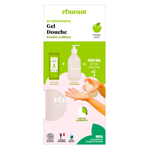 Ce kit contient 1 bouteille 300ml + 1 recharge de gel douche en poudre à diluer. Une recharge en poudre de 25 gr à diluer avec l'eau du robinet permet de créer 250 ml de gel douche