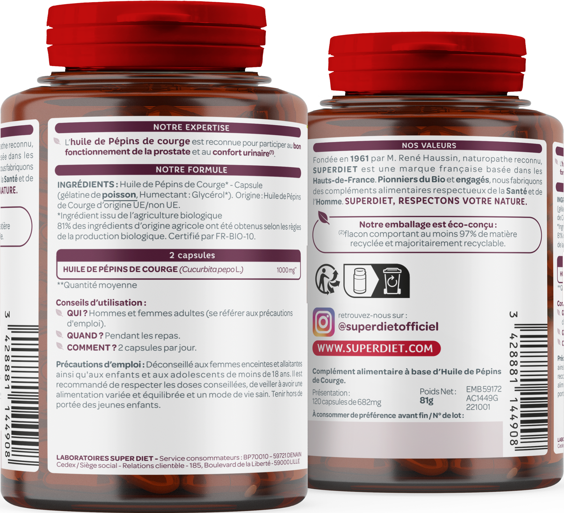 Chez Superdiet, nous avons développé des gélules à base d'huile de Pépins de Courge, qui contribuent au confort urinaire et soutiennent le bon fonctionnement de la prostate.